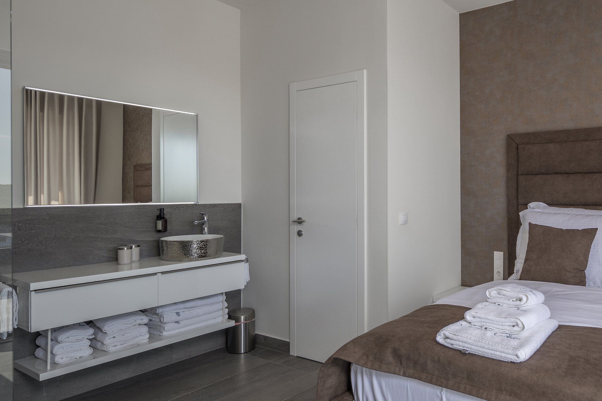 On the upper floor there are three more bedrooms, each with a double bed, TV and integrated bathroom. Also fully equipped with fitted wardrobe, shower, toilet, underfloor heating, hair dryer, towels and more. In the two bedrooms there are extra pull-out beds (160cm x 190cm) that can be used as a bed for eg your children. All bedrooms have access to a large roof terrace. From here you can enjoy a beautiful view of nature, pool and sea.